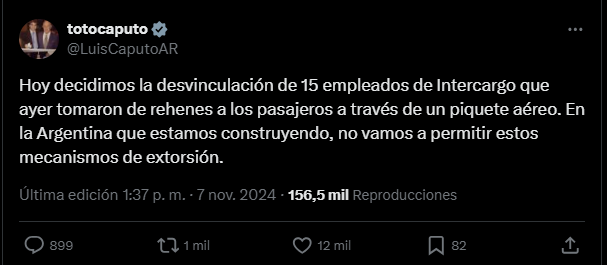 “Hoy decidimos la desvinculación de 15 empleados de Intercargo que ayer tomaron de rehenes a los pasajeros a través de un piquete aéreo”, publicó el ministro de Economía, Luis “Toto” Caputo en su cuenta de “X”.