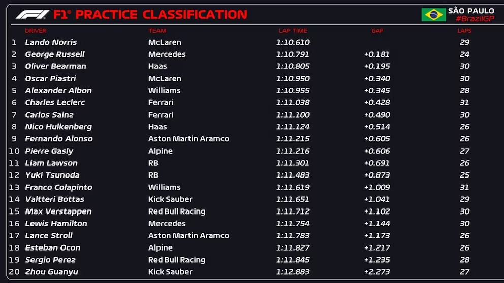 El piloto argentino de Williams, Franco Colapinto, concluyó en la décima tercera posición durante la primera sesión de pruebas libres del Gran Premio de Brasil, que se está llevando a cabo en el Autódromo José Carlos Pace de Interlagos, San Pablo.