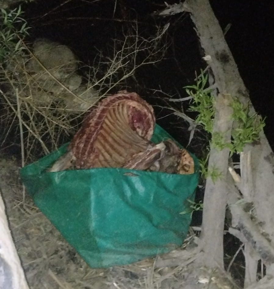 De inmediato, una patrulla de la Policía Rural se desplazó hasta el lugar y, tras entrevistar al encargado, inició un rastrillaje por los alrededores. A poca distancia, los efectivos lograron dar con dos personas que fueron sorprendidas in fraganti mientras faenaban un animal bovino.