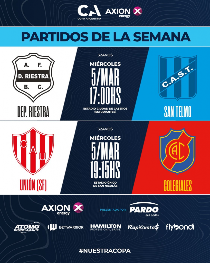 Además, por la Copa Argentina, Deportivo Riestra chocará con San Telmo, y Unión de Santa Fe hará lo propio ante Colegiales.