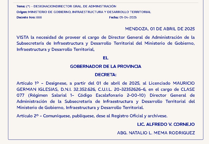 En este caso, Mauricio, fue designado como nuevo director general de la Subsecretaría de Infraestructura y Desarrollo Territorial, tal cual se lee en el Decreto Nº 666 publicado en el Boletín Oficial.