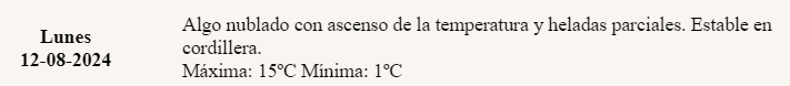 Además, adelantaron “heladas parciales” y estabilidad en cordillera. En lo que refiere a la máxima, precisaron que la misma no superaría los 15 grados.