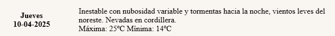 Además, pronosticaron la llegada de “vientos leves del noreste” y “nevadas en cordillera”.
