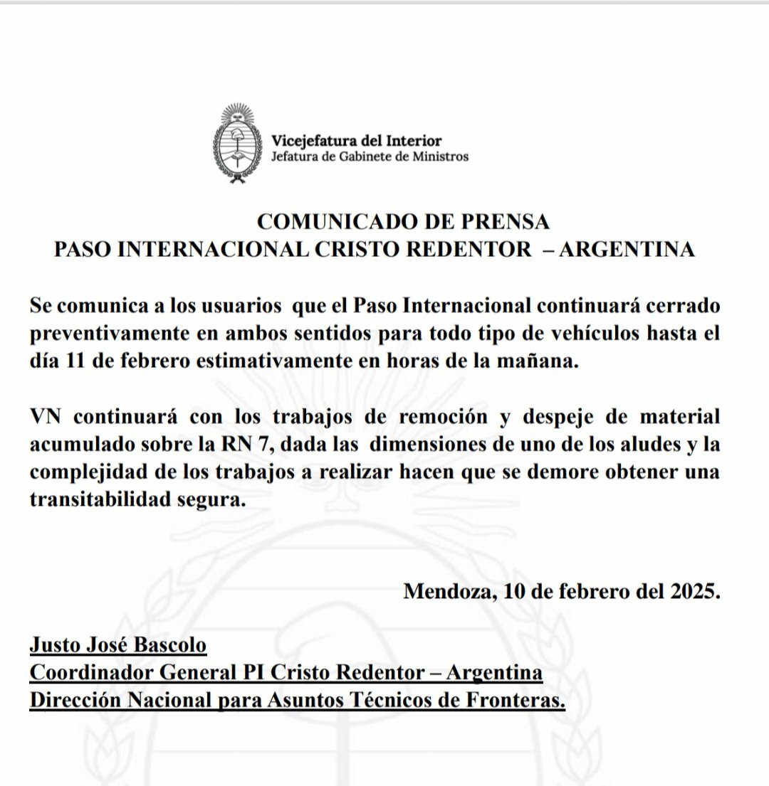 La coordinación argentina de frontera informó que este lunes no habilitarán el tránsito en la Ruta 7, a raíz de la demora en las tareas de remoción y de despeje de la carpeta asfáltica tras los aludes que complicaron la circulación vehicular.