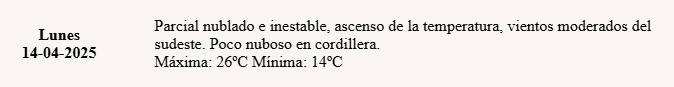 Además, anunciaron “ascenso de la temperatura” y “vientos moderados del sudeste”. Por otra parte, pronosticaron poca nubosidad en cordillera.