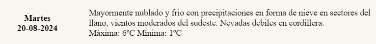 De acuerdo a lo difundido por voceros del organismo, se espera un martes “mayormente nublado y frío con precipitaciones en forma de nieve en sectores del llano”.
