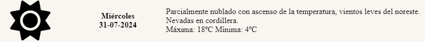 Además, anunciaron la llegada de “vientos leves del noreste” y “nevadas en cordillera”. En lo que refiere a la máxima, la misma no superaría los 18 grados.