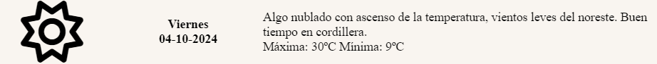 Además, pronosticaron “vientos leves del noreste” y “buen tiempo en cordillera”. En cuanto a la máxima, indicaron que la misma no superaría los 30 grados.