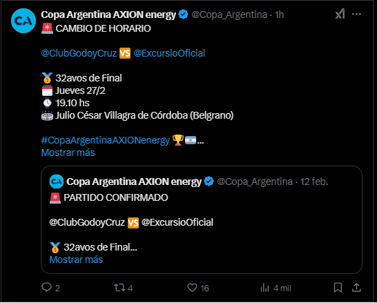 Desde la organización del torneo confirmaron un importante cambio en el partido que enfrentará a Godoy Cruz con el equipo de la Primera B Metropolitana.