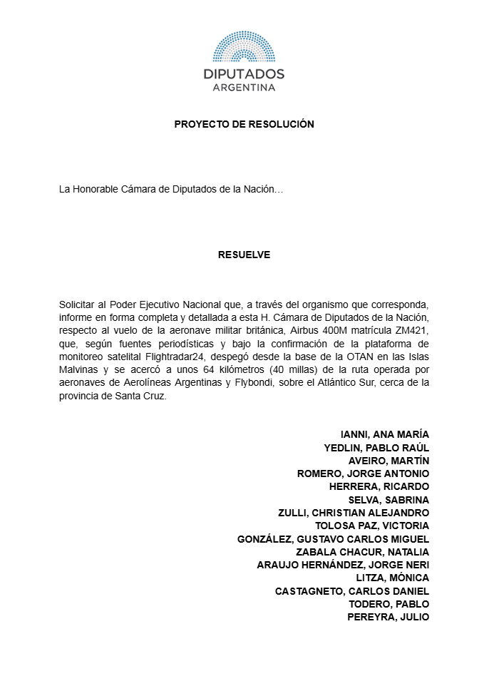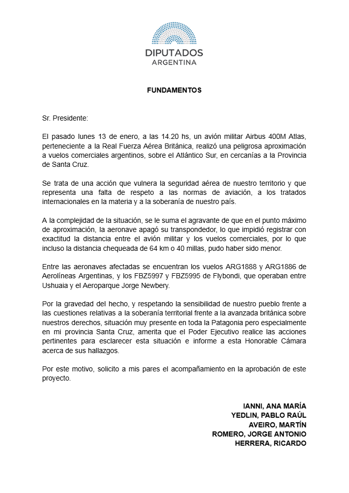 En la fundamentación de la iniciativa encabezada por la santacruceña Ana María Ianni, detallaron que el pasado 13 de enero a las 14.20 “un avión militar Airbus 400M Atlas, perteneciente a la Real Fuerza Aérea Británica, realizó una peligrosa aproximación a vuelos comerciales argentinos, sobre el Atlántico Sur”. Además, señalaron que el vuelo y los puntos de salida y despegue fueron confirmados a través de la plataforma “Flightradar24” y por “fuentes periodísticas”.