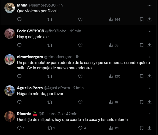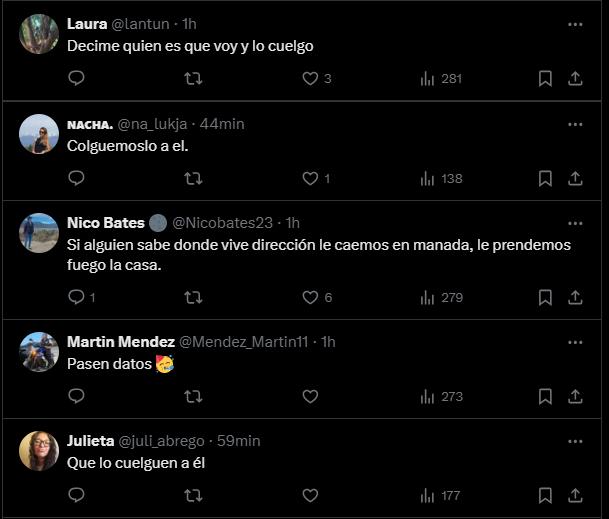 “Que lo cuelguen a él”, manifestó otro usuario de “X”. “Ojala alguien se la ponga”, expresó otra joven indignada por lo ocurrido.