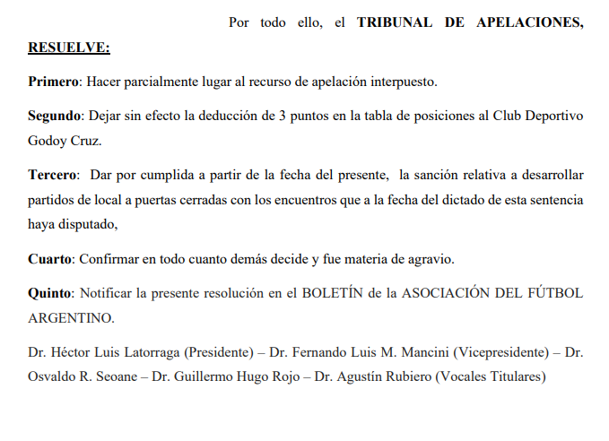 Sin embargo, este martes la AFA comunicó que se decidió “dejar sin efecto la deducción de tres puntos en la tabla de posiciones al Club Deportivo Godoy Cruz”, tal como señala el fallo del Tribunal de Apelaciones.