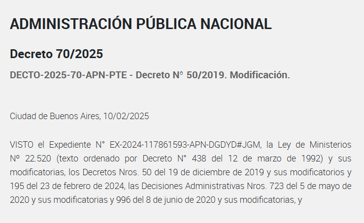 Este martes, el Gobierno avanzó con una nueva reestructuración del Ministerio de Economía, mediante la publicación del Decreto 70/2025 en el Boletín Oficial. La medida implica cambios significativos en la estructura de la cartera económica, con la eliminación y fusión de áreas estratégicas en busca de una administración más eficiente y menor gasto público.