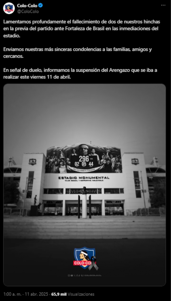 Colo Colo, a través de su perfil en X, señaló. “Lamentamos profundamente el fallecimiento de dos de nuestros hinchas en la previa del partido ante Fortaleza de Brasil en las inmediaciones del estadio“, expresó el club.