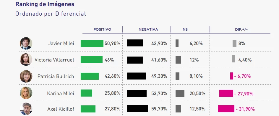 En ese sentido, el estudio de Reale señala que Milei sigue encabezando el ranking de imagen de dirigentes en Argentina. Con un 50,9% de valoración positiva, el presidente supera a otros políticos y mantiene una posición de liderazgo a nivel nacional.