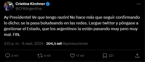Este enfrentamiento comenzó con un documento titulado “Es la economía bimonetaria, estúpido”, en el que Kirchner criticó la política económica de Milei. Ante la respuesta del presidente, quien señaló que “de economía no entendés mucho“, Cristina replicó: “Hablar de economía diciendo cualquier cosa en la televisión o escribir plagiando libros es una cosa. Gobernar la Argentina es otra muy distinta”.