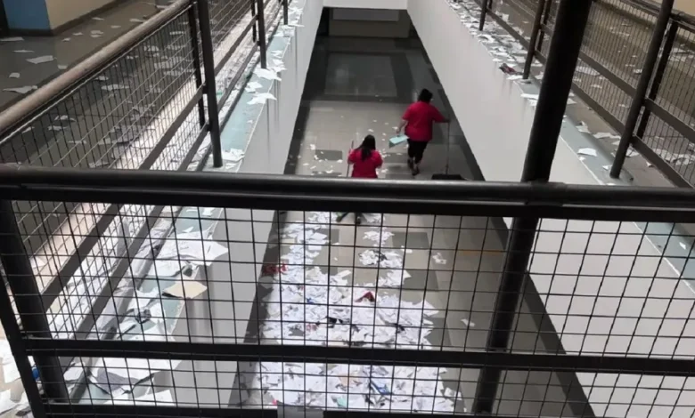 En las imágenes se veía a los adolescentes arrojando hojas de carpetas por pasillos, escaleras y el patio interno del edificio escolar, que derivó rápidamente en descontrol.