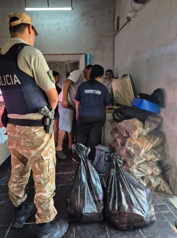 Durante la inspección, los efectivos y técnicos constataron la presencia de carne vacuna, achuras, embutidos y cueros de mondongo que no reunían los requisitos sanitarios mínimos. La mercadería fue retirada del circuito comercial para evitar riesgos a la salud pública.