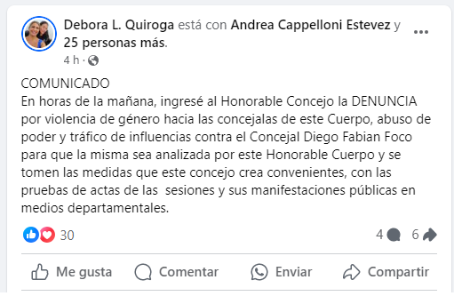 “En horas de la mañana, ingresé al Honorable Concejo la DENUNCIA por violencia de género hacia las concejalas de este Cuerpo, abuso de poder y tráfico de influencias contra el Concejal Diego Fabian Foco para que la misma sea analizada por este Honorable Cuerpo y se tomen las medidas que este concejo crea convenientes, con las pruebas de actas de las sesiones y sus manifestaciones públicas en medios departamentales“, se lee en el texto que Quiroga que difundió en redes sociales.