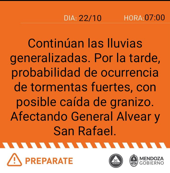 La alerta naranja indica que seguirán las lluvias generalizadas. “Por la tarde probabilidad de ocurrencia de tormentas fuertes, con posible caída de granizo”. Afectará General Alvear y San Rafael.