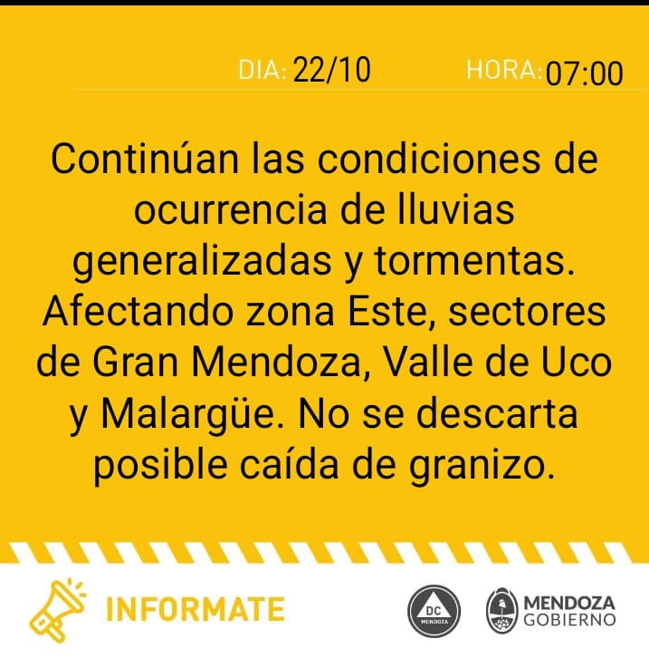 Además, afectará zona Este, sectores de Gran Mendoza, Valle de Uco y Malargüe. “No se descarta posible caída de granizo”, concluye.