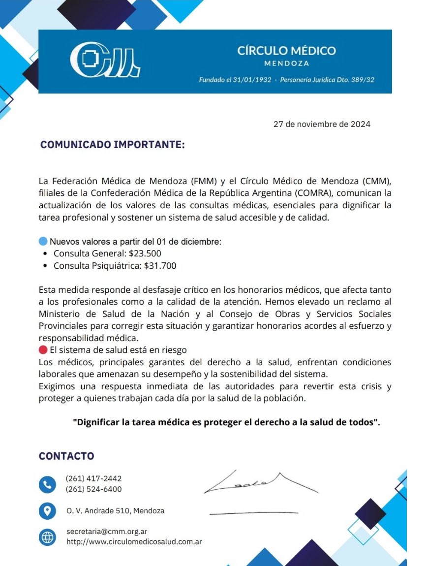 La Federación Médica de Mendoza (FMM) y el Círculo Médico de Mendoza (CMM) informaron los nuevos valores que tendrán desde 1 de diciembre las consultas médicas.