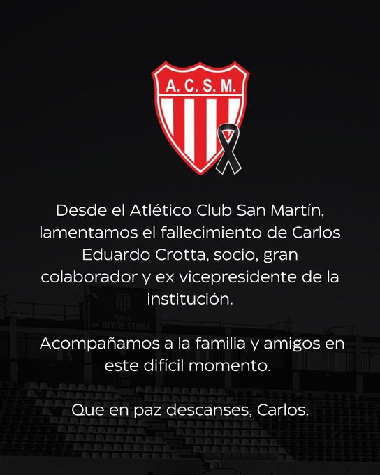 “Desde el Atlético Club San Martín lamentamos el fallecimiento de Carlos Eduardo Crotta, socio, gran colaborador y ex vicepresidente de la institución. Acompañamos a la familia y amigos en este difícil momento. Que en paz descanses, Carlos.”