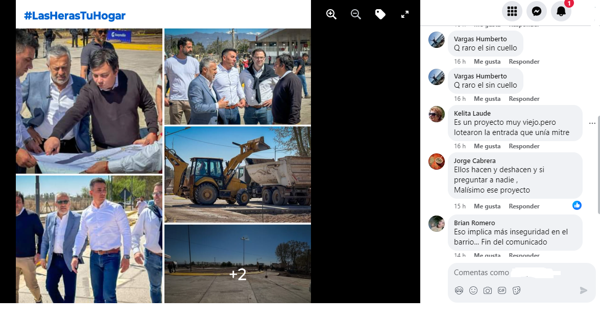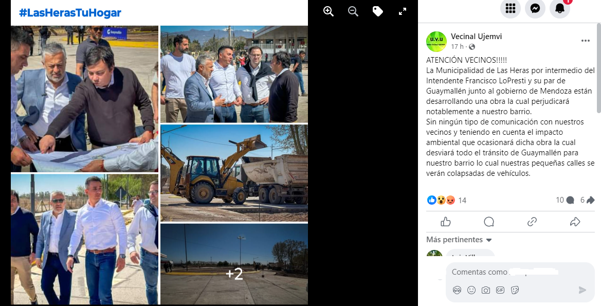 “La Municipalidad de Las Heras por intermedio del Intendente Francisco Lo Presti y su par de Guaymallén junto al gobierno de Mendoza están desarrollando una obra la cual perjudicará notablemente a nuestro barrio“, manifestaron a través de sus redes sociales.