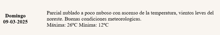 La temperatura continuará en ascenso, con una máxima de 26°C y una mínima de 12°C. No se esperan lluvias ni cambios bruscos en las condiciones del tiempo.