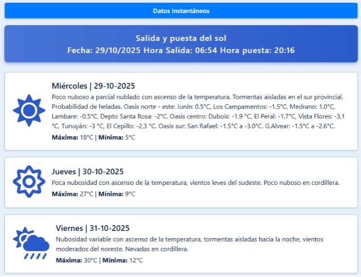 Nubosidad: Amanecerá seminublado en Malargüe, despejado en el resto de la provincia. Desde las 20, se prevé probabilidad de lluvias débiles en el llano de Malargüe y en el Oeste del Valle de Uco asociadas al mal tiempo en Alta Montaña.