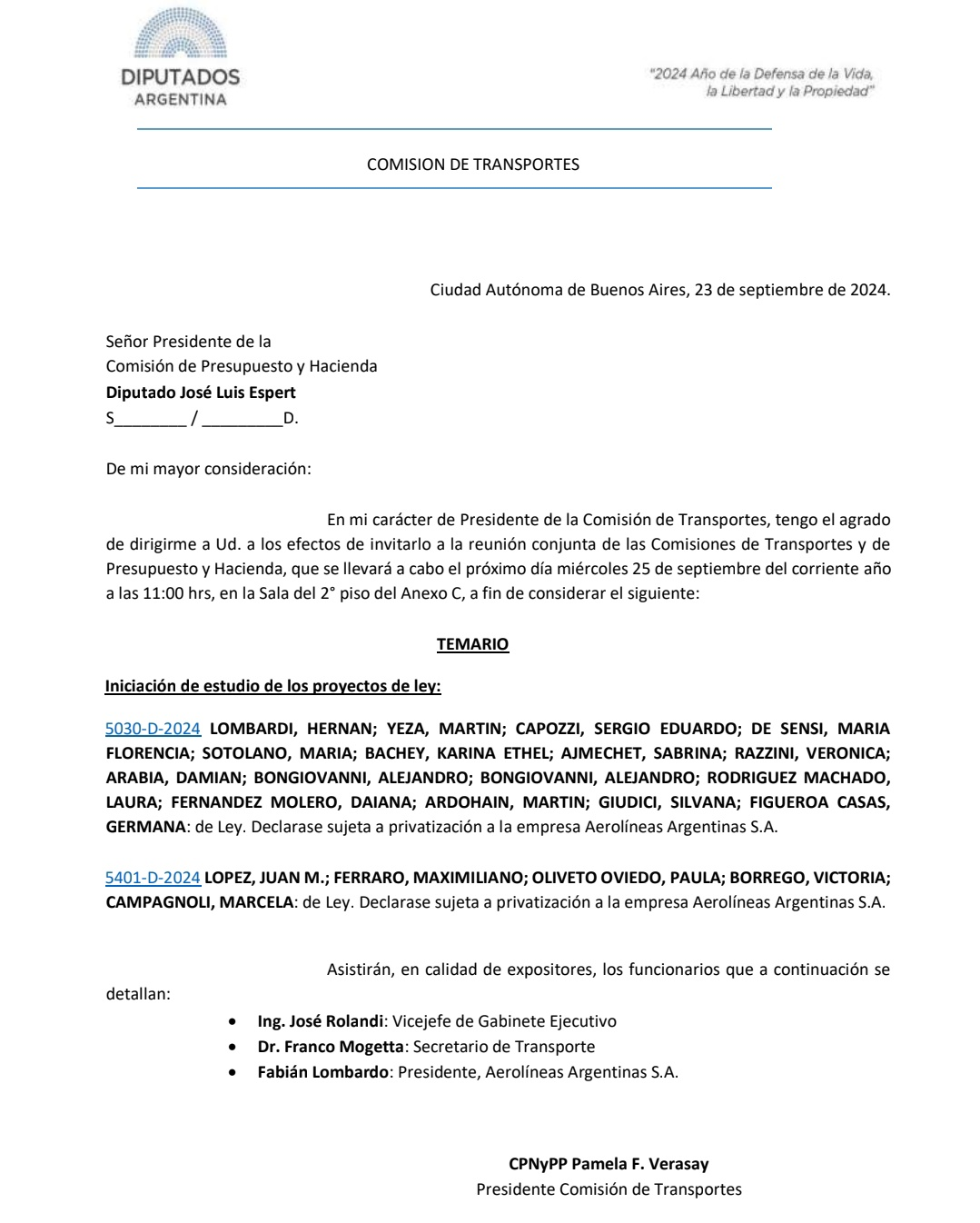 Mañana, a partir de las 11:00, se llevará a cabo un plenario de las comisiones de Transporte y de Presupuesto y Hacienda, que lideran la mendocina Pamela Verasay y el libertario José Luis Espert.