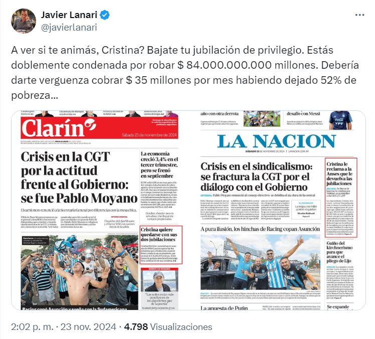 Por su parte, el subsecretario de Prensa de la Presidencia, Javier Lanari, le contestó a la expresidenta: “A ver si te animás, Cristina. Bajate tu jubilación de privilegio. Estás doblemente condenada por robar $84 mil millones. Debería darte vergüenza cobrar $35 millones por mes habiendo dejado 52% de pobreza”.