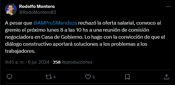 “A pesar que Ampros rechazó la oferta salarial, convoco al gremio el próximo lunes 8 a las 10 horas a una reunión de comisión negociadora en Casa de Gobierno. Lo hago con la convicción de que el diálogo constructivo aportará soluciones a los problemas a los trabajadores“, publicó en su cuenta de “X” el funcionario.