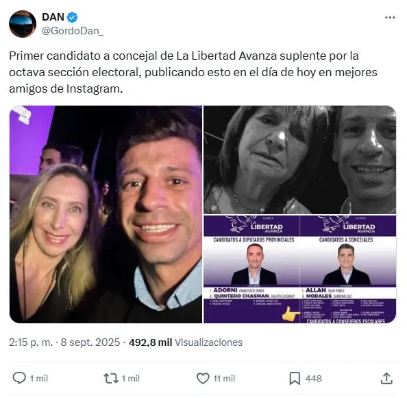 Luego, cuestionó al diputado provincial electo por la Tercera Sección, Maximiliano Bonadarenko, por contar que su “mamá es jubilada y no llega a fin de mes”. Tras esa declaración, El Gordo Dan tuiteó: “El flamante diputado electo por la Libertad Avanza Maximiliano Bondarenko le suelta la mano a Milei y le atribuye la derrota electoral al plan económico del equipo que destruyó la inflación en la Argentina un día después de la elección”.