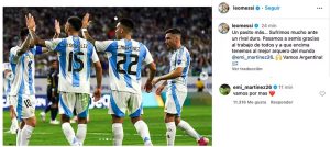 “Un pasito más… Sufrimos mucho ante un rival duro. Pasamos a semis gracias al trabajo de todos y a que encima tenemos al mejor arquero del mundo @emi_martinez26. Vamos Argentina”, escribió Messi tras el dramático 4-3 en la tanda de penales que selló la clasificación a las semifinales de la Copa América.