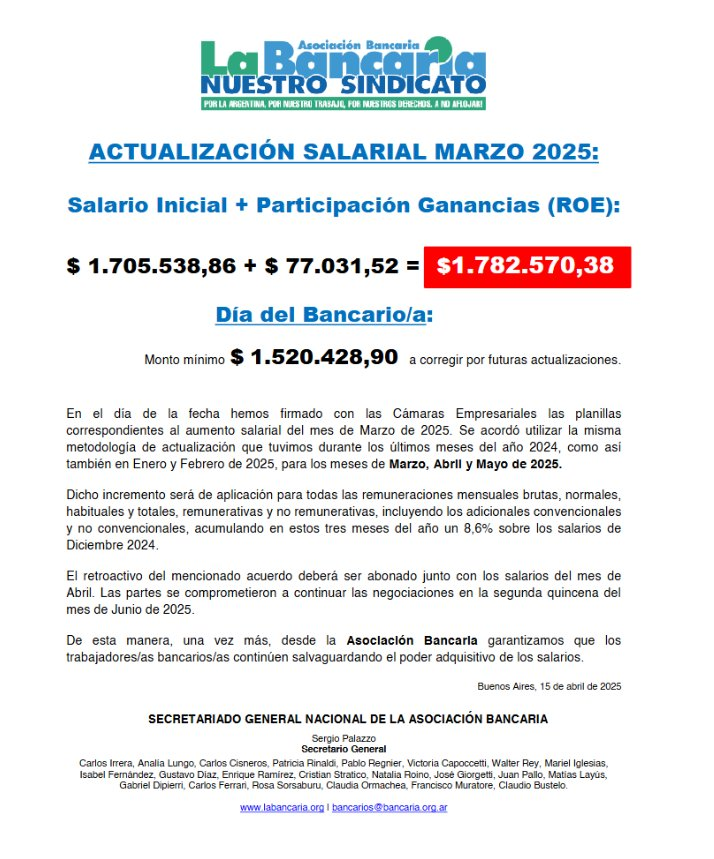 La Asociación Bancaria, que tiene al frente al mendocino Sergio Palazzo, acordó un salario inicial de los trabajadores del sector de $1.782.570,38 a partir de marzo, tras alcanzar un nuevo acuerdo paritario con las cámaras empresarias.