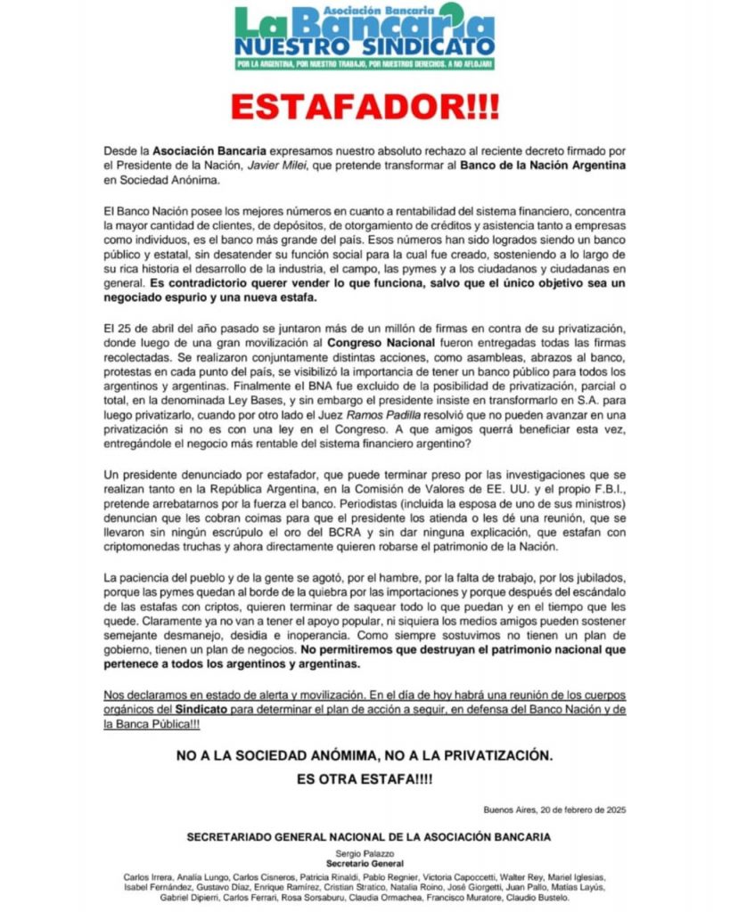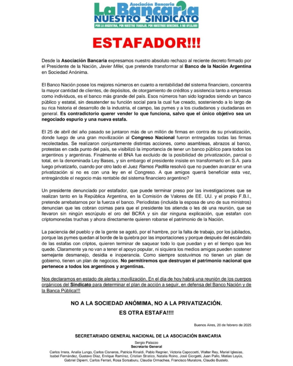 Además, desde La Bancaria acusaron a Javier Milei de “estafador” por el escándalo $LIBRA. “Un presidente denunciado por estafador, que puede terminar preso por las investigaciones que se realizan tanto en la República Argentina, en la Comisión de Valores de EE. UU. y el propio F.B.I., pretende arrebatarnos por la fuerza el banco. Periodistas (incluida la esposa de uno de sus ministros) denuncian que les cobran coimas para que el presidente los atienda o les dé una reunión, que se llevaron sin ningún escrúpulo el oro del BCRA y sin dar ninguna explicación, que estafan con criptomonedas truchas y ahora directamente quieren robarse el patrimonio de la Nación”, sentenciaron.