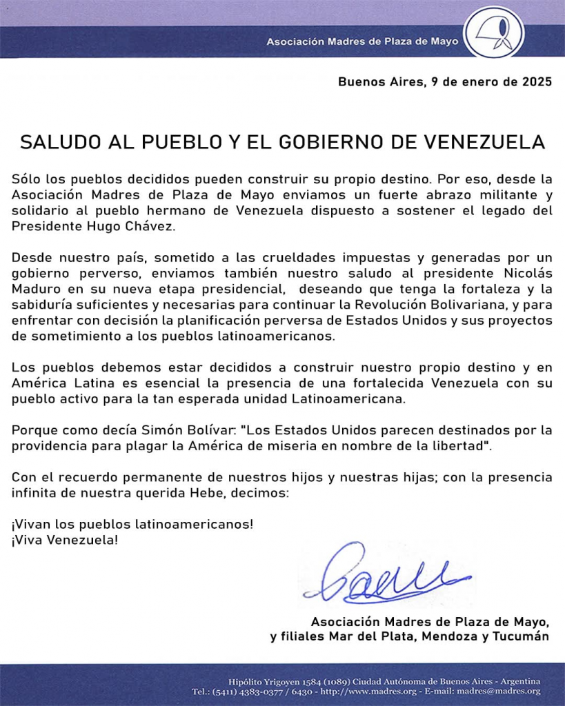 Por otra parte, consideraron que Argentina está “sometida a las crueldades impuestas y generadas por un gobierno perverso” y le deseó suerte a Maduro en el nuevo mandato presidencial, pese a las denuncias de fraude por parte de la oposición local y la comunidad internacional. “Los pueblos debemos estar decididos a construir nuestro propio destino y en América Latina es esencial la presencia de una fortalecida Venezuela con su pueblo activo para la tan esperada unidad latinoamericana”, completaron.