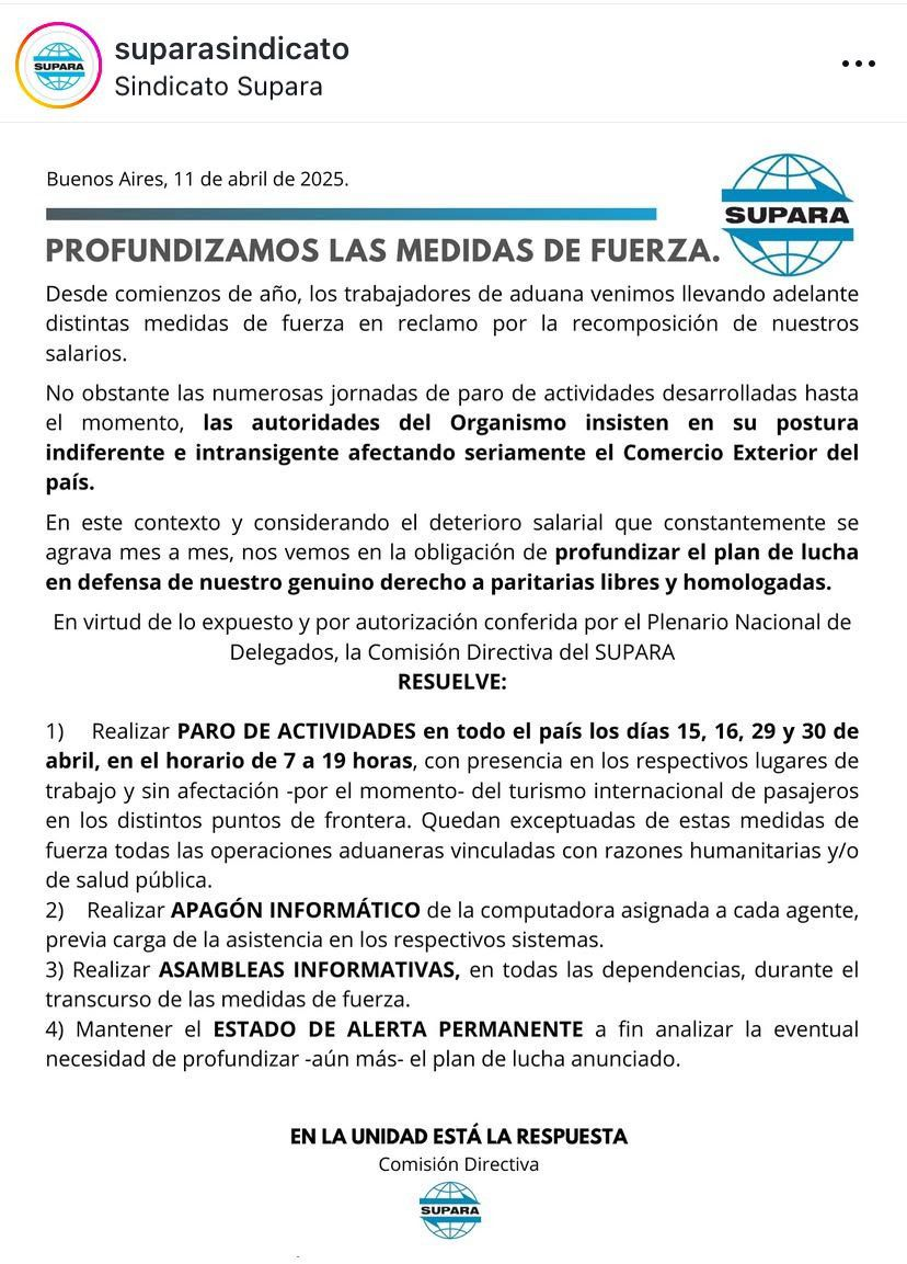 Lunes 14 de abril cierre de 23 a 9 (por los trabajos de mantenimiento en el túnel). Martes 15, miércoles 16 y jueves 17 de abril paro del personal de Aduana Argentina de 7 a 19. Atención con guardias mínimas. Considere esta información para organizar su viaje y tiempo de espera”, informaron desde la coordinación de fronteras.