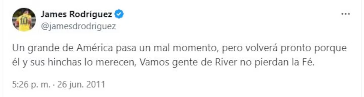 En aquel momento, James, quien se encontraba en el Porto de Portugal, sorprendió a muchos con un mensaje cargado de empatía y admiración hacia el club de Núñez.