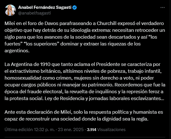 “(Javier) Milei en el foro de Davos parafraseando a Churchill expresó el verdadero objetivo que hay detrás de su ideología extrema: necesitan retroceder un siglo para que los avances de la sociedad sean descartados y así ‘los fuertes’ y ‘los superiores'” dominen y extraigan “las riquezas de los argentinos“, se lee en un reciente posteo que realizó en “X”.