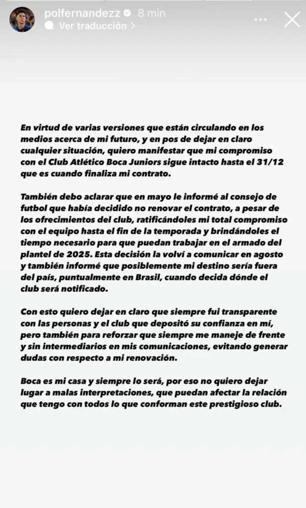 Guillermo Fernández cerró el comunicado con una frase en la que daría a entender que desde La Ribera estarían tergiversando la información: “Boca es mi casa y siempre lo será, por eso no quiero dejar lugar a malas interpretaciones, que puedan afectar la relación que tengo con todos los que conforman este prestigioso club”, concluyó.