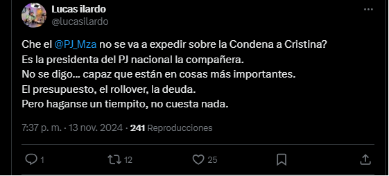 Sin embargo, el Partido Justicialista de Mendoza guardó silencio y no se pronunció. Esta postura no le cayó para nada bien al ex legislador Lucas Ilardo, ligado políticamente al kirchnerismo.
