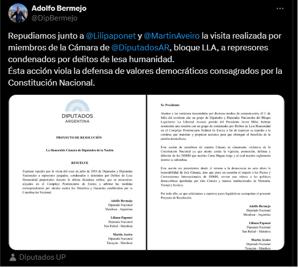 En redes sociales, Bermejo compartió el proyecto en cuestión y agregó: “Repudiamos junto a Liliana Paponet y Martín Aveiro la visita realizada por miembros de la Cámara de Diputados del bloque La Libertad Avanza (LLA) a represores condenados por delitos de lesa humanidad”.