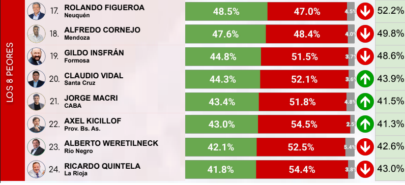 En lo más alto del ranking el que se destaca es el santafesino Maximiliano Pullaro, que hasta el momento cosechó una imagen positiva del 61,9%. Más abajo está Ignacio Torres, de Chubut, con el 61%. Leandro Zdero y Gustavo Valdés, se posicionaron tercero y cuarto, respectivamente.