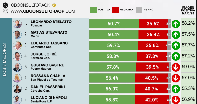En primer lugar quedó Leandro Stelatto, jefe comunal de Posadas, que terminó con el 60,7% de imagen positiva y el 35,6% de negativa.