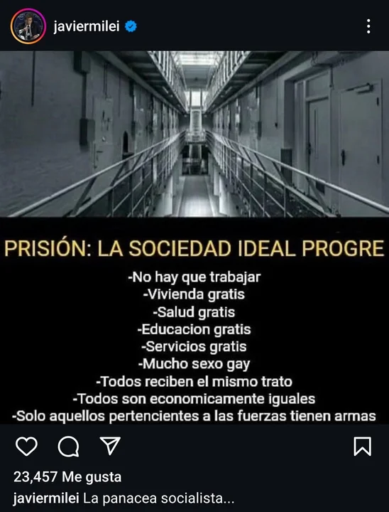 A través de su Instagram, el mandatario publicó la imagen de una prisión que utilizó para cuestionar el acceso gratuito a la vivienda, la salud, la educación y “el sexo gay”.