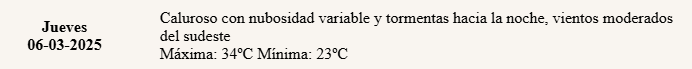 De acuerdo a lo anunciado por voceros del organismo, se espera un jueves “caluroso con nubosidad variable y tormentas hacia la noche”.