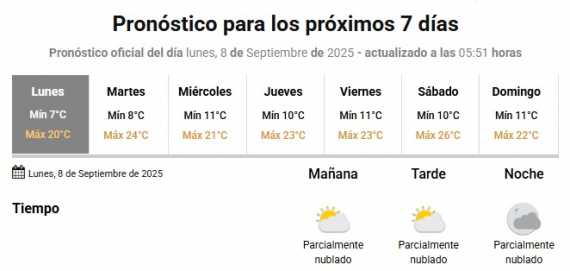 Según los datos del Servicio Meteorológico Nacional, la máxima esperada para hoy será de 20°, mientras que la mínima fue de 7°.