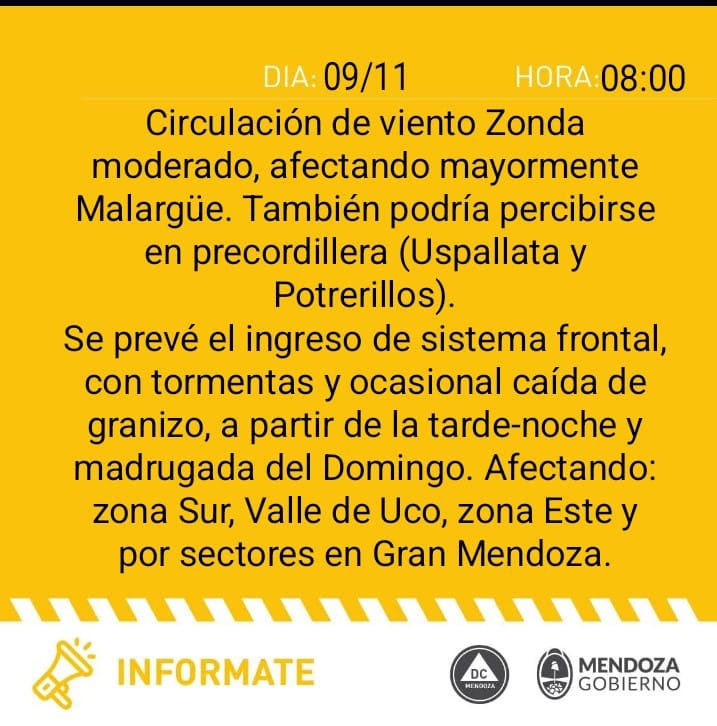 De acuerdo al alerta que trascendió recientemente, podría registrarse viento Zonda en el departamento sureño de Malargüe, aunque también podría percibirse en “Uspallata y Potrerillos“.
